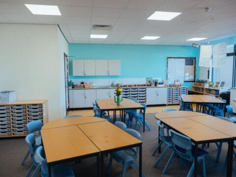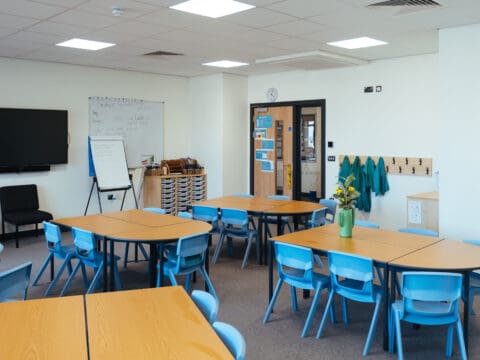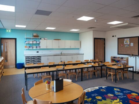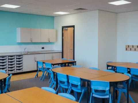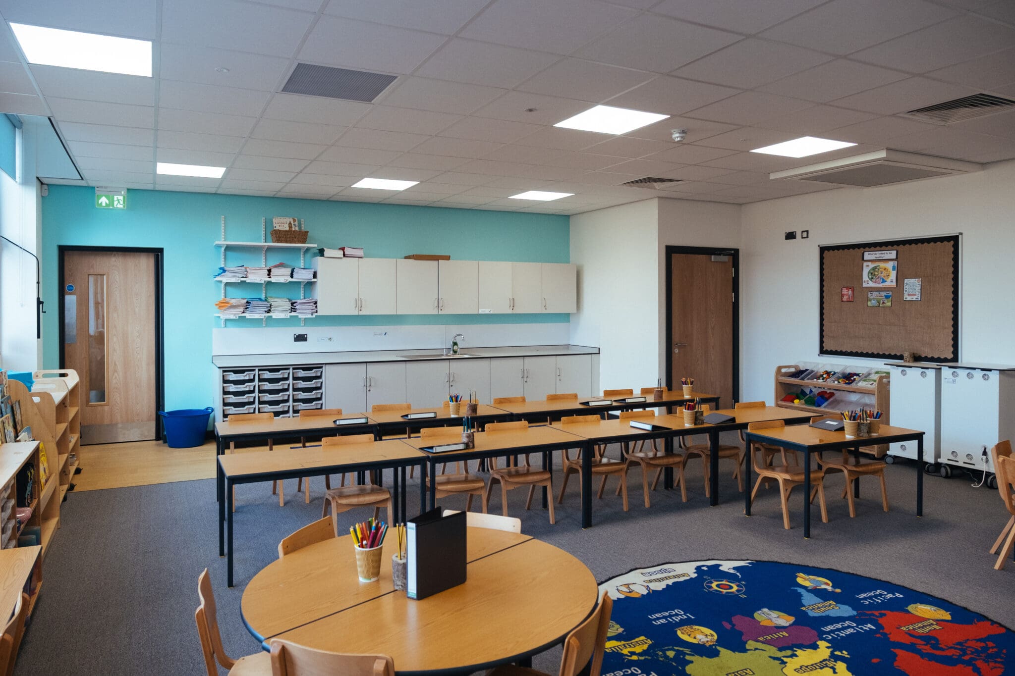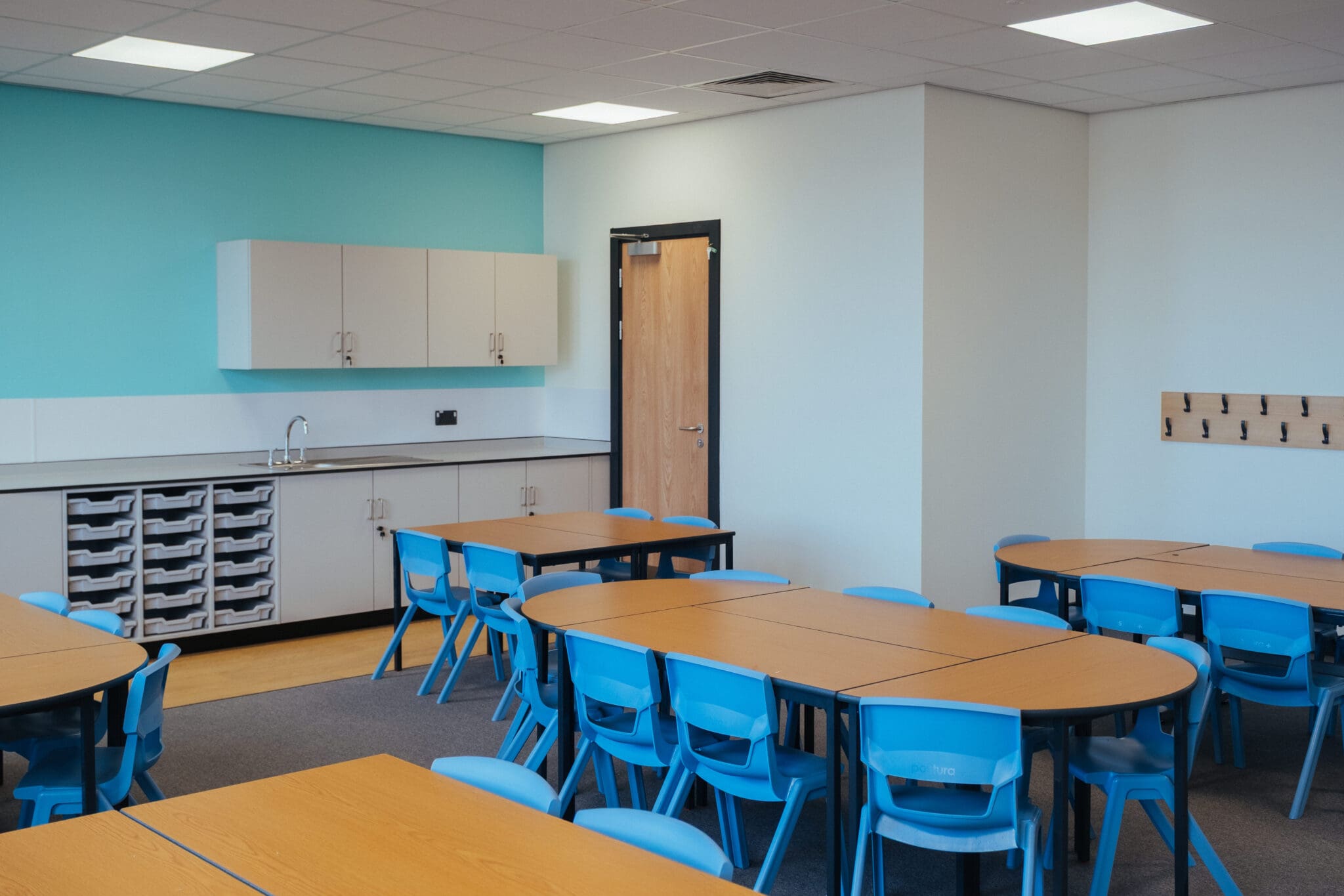 Our design team created the wonderful Nursery Playroom, Infant and Junior Classrooms and the Reception, as well as the Main Hall, Library, Studio Room and the combined Design Technology, Food Technology and Science rooms. And, although this is not a SEND specialist school, our team used their SEND expertise to create 2 rooms for children with extra learning needs including an MI Therapy room and a group space.
